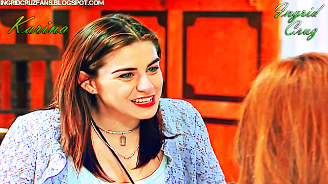 Esta escena me encanta, es una de mis favoritas, amo como sale vestida con esos colores claros, con esa polera cortita apretada con esa blusita de encajes, con esos pantalones. Su pelo hermoso, su maquillaje, tenía la esperanza que la dieran completa pero saltaron 30 segundos donde Karina llega hermosa y radiante al bar, habla como argentina con ese acento maravilloso que le sale, se ríe con Leticia porque le cae muy bien ella, Leticia dice que su cama es exquisita, Karina le responde que está cargada de buenas vibras y energías, también le dice que canta súper lindo, Leticia comenta que supo que se va a estudiar a los EEUU por parte de Adriano, acá comienza lo que dieron donde Karina cambia de tema y le cuenta que vino la Beatriz al bar y le conto que eras hija ilegítima viejo pero no le creyó, Melisa no puede creer que la Beatriz haya estado anoche y la haya visto, no puede saber quién es, Karina no entiende porque le pone tanto color, Melisa le recuerda el trato que tiene con Raquel para que se vaya a Mendoza y quiere que se preocupe que Beatriz no sepa quién es, llega en su tía Transito muy feliz le da un besito en la mejilla a Karina porque piensa que la vino a ver, Karina fría dice que no la vine a ver a usted sino que a la Leti, buenas tardes que la pasen bien, voy a ver a unos amigos al cerro del al lado, su tía Tránsito queda muy triste y piensa que nunca la va a perdonar, Leticia cree que lo mejor es Karina sienta que Adriano es su padre a que sepa quién es su verdadero padre