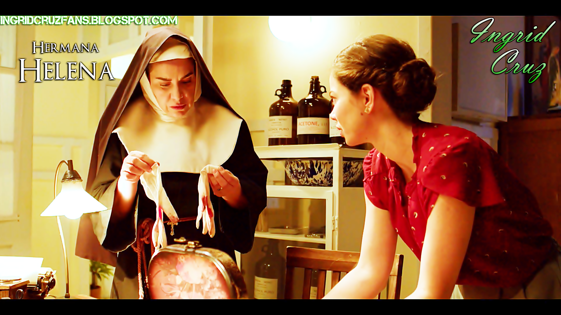 abre, la Hermana Helena saca una guantes blancos con sangre, los huele, con